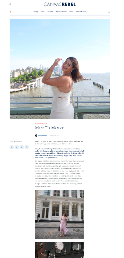 Tia Metaxas is a Marketer, Content Creator, Model/Actress, Yoga Teacher and Creative leader who has a huge passion for life and sharing her energy with the world doing what she loves. Tia is based in New York City but originally from Melbourne, Australia.